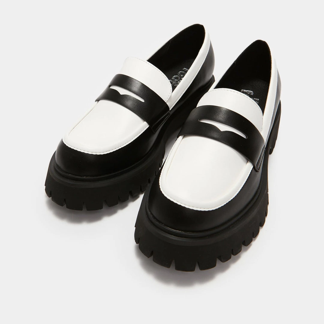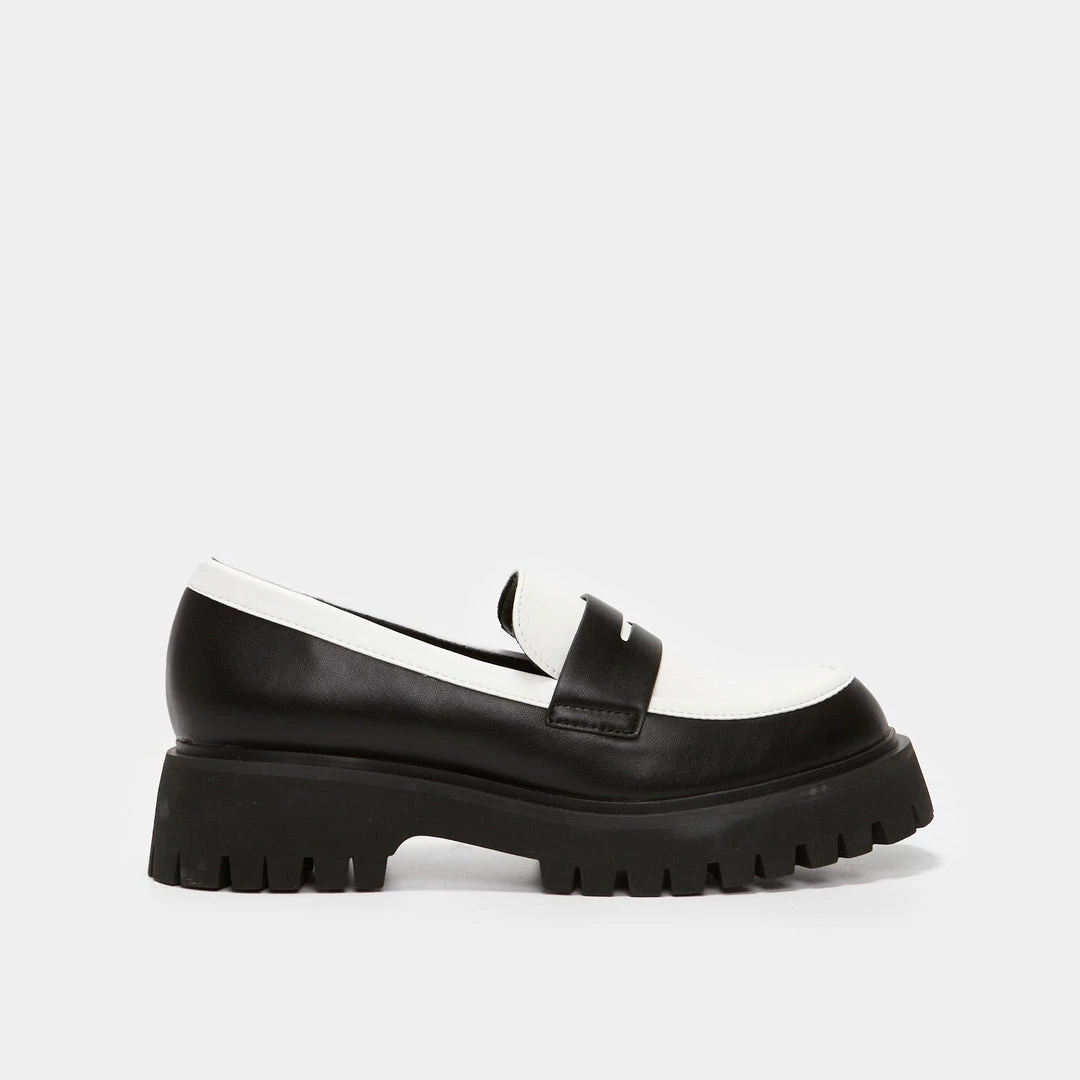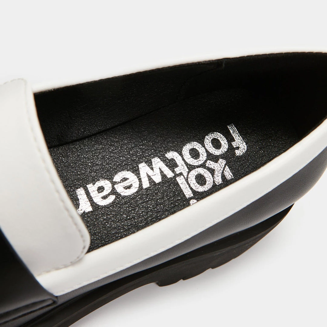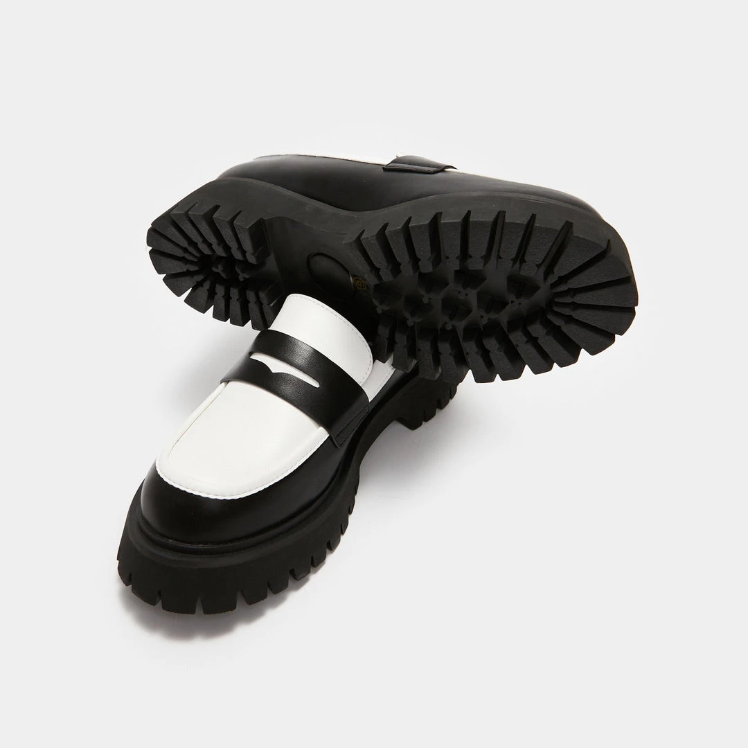 Birch Monochrome Loafers with a twist, slide them on and you are ready to go. These black loafer feature white detailing on the top, have a top snitching, penny loafer design and chunky insole.Β