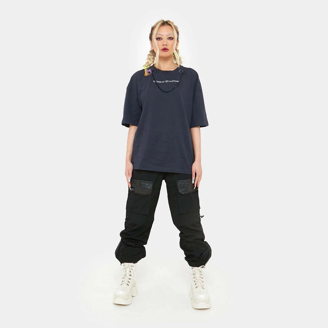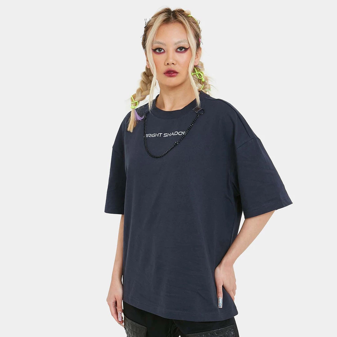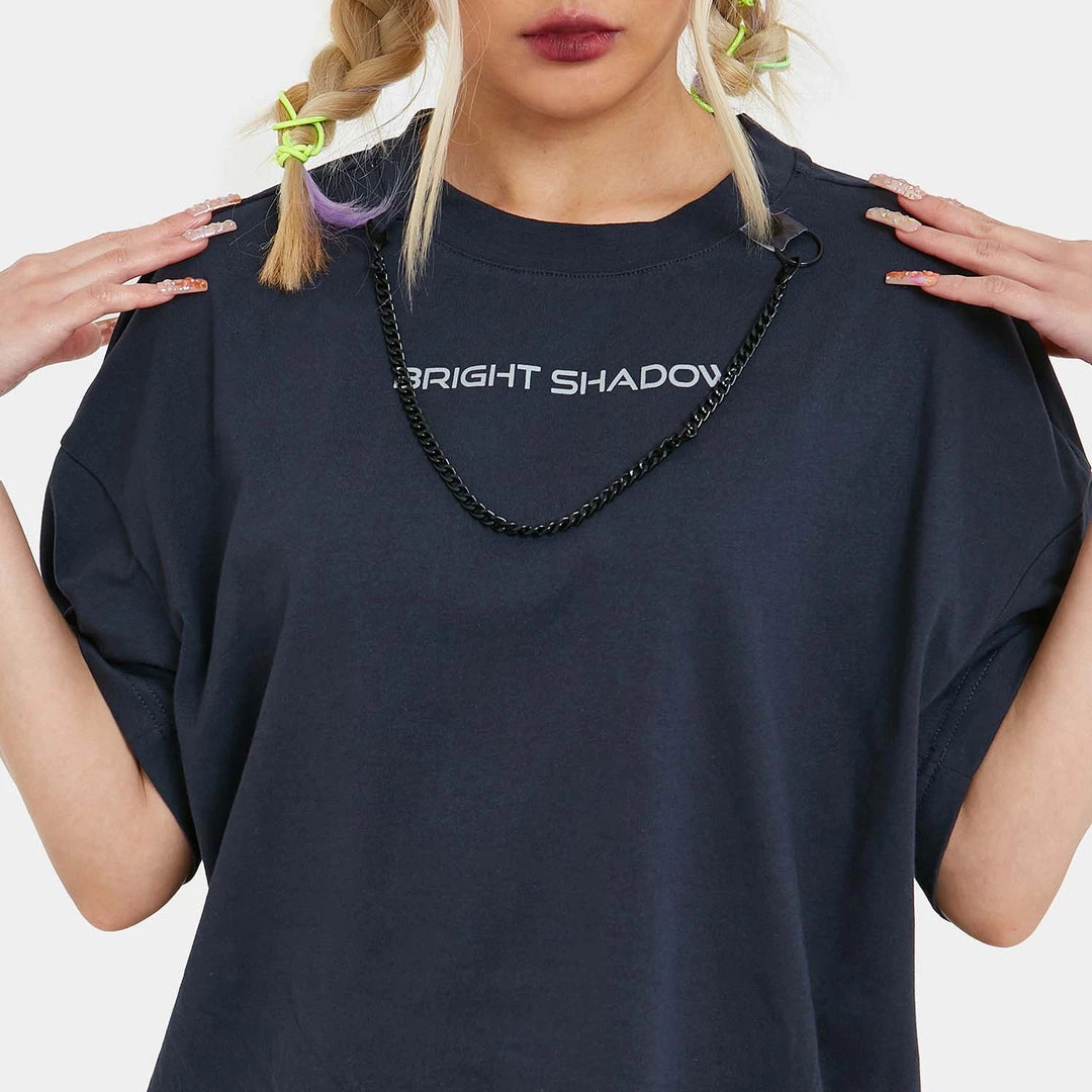 I see people talking to me, whispering and then disappearing. Are they real or just bright shadows lingering around me? Bright Shadow features, short sleeved printed tee with an attached chain.Â