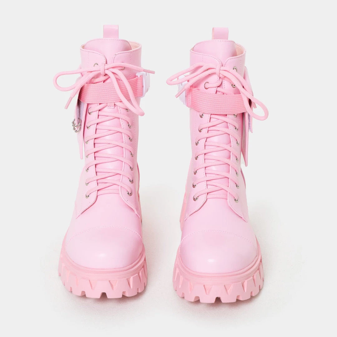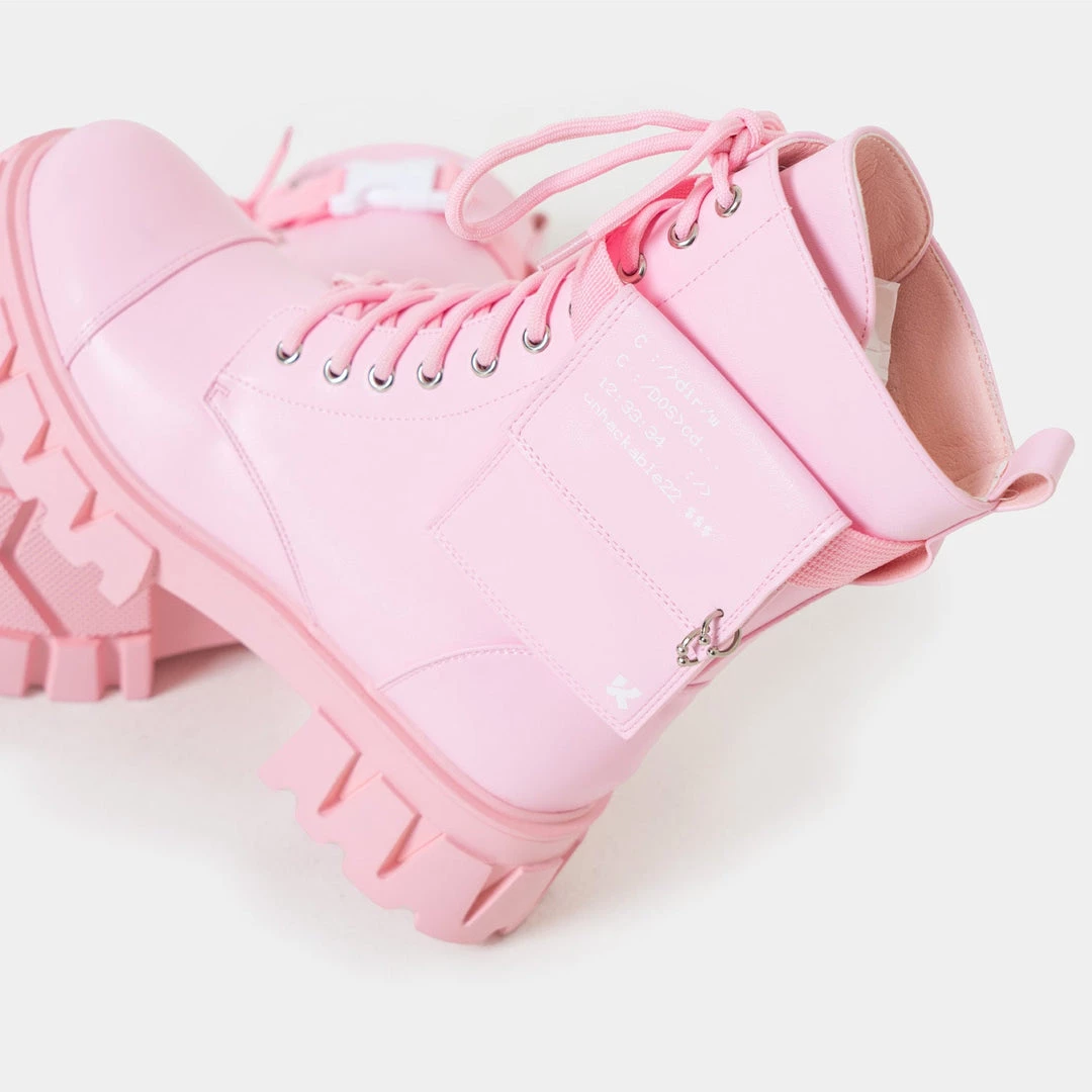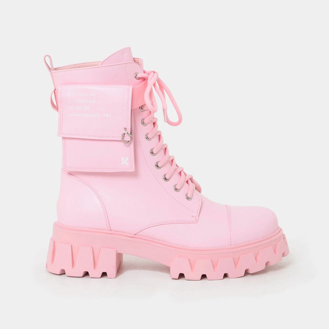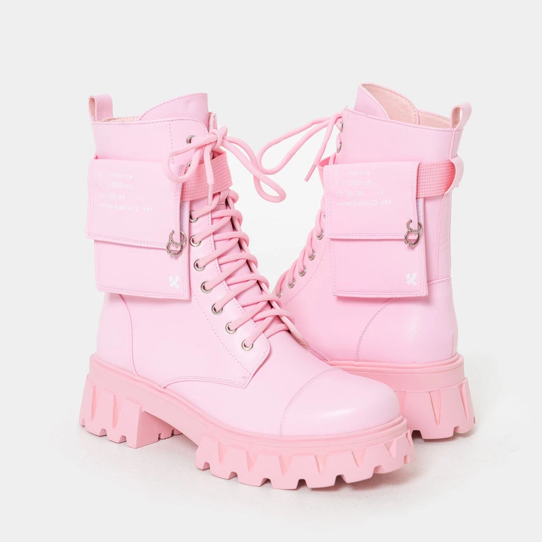 dressing however we feel comfortable: functional and powerful. These Koi Footwear vegan chunky boots have a pouch detail to fit whatever little trinket you want to put in there – and we can guarantee you’ll be in ultimate comfort all night. Ideal for when you need versatility and want to be able to walk straight back from the afterparty. These vegan leather boots lace up and are a sickly sweet light pink colour.