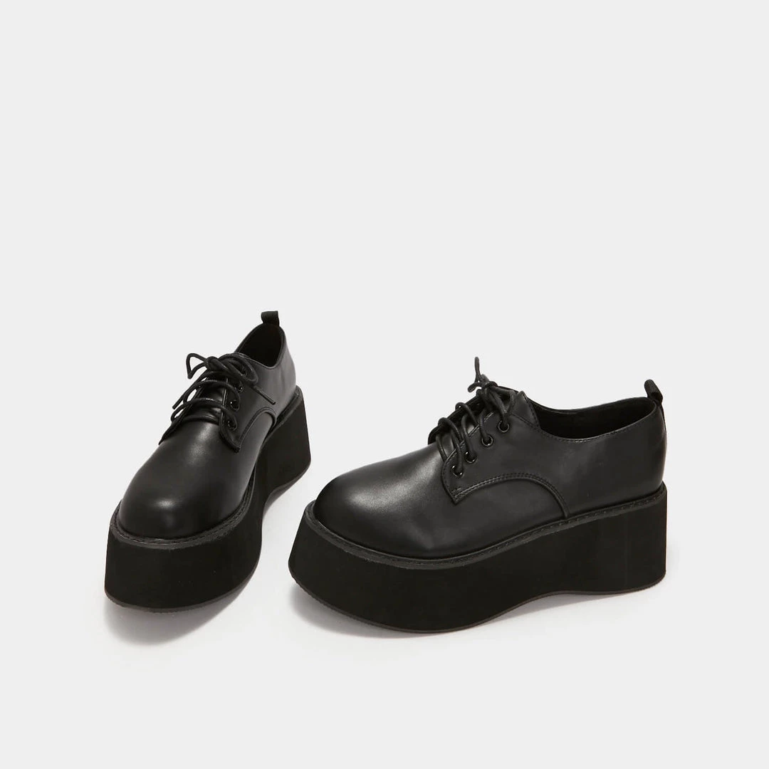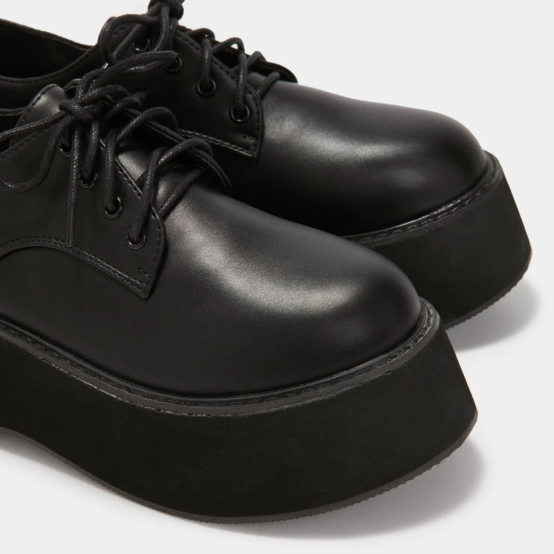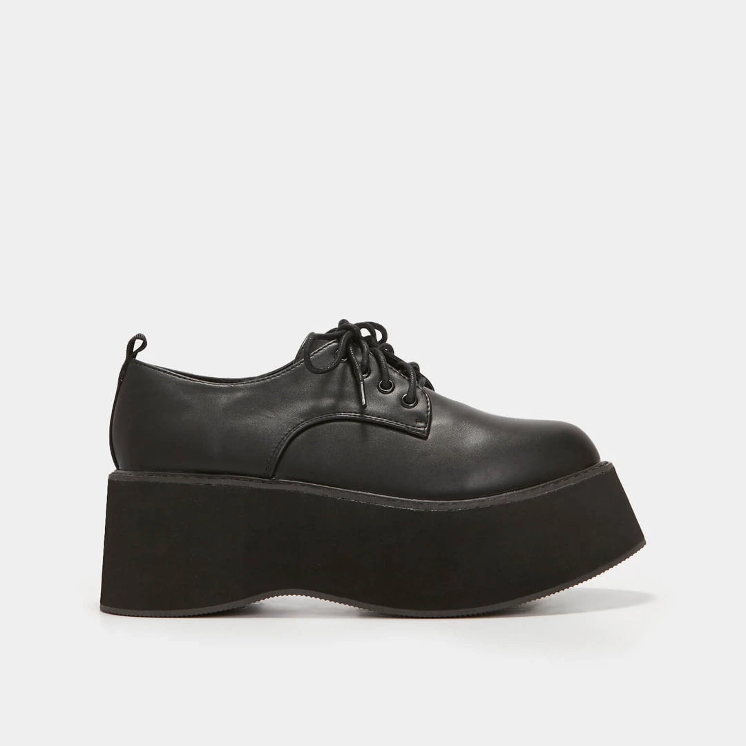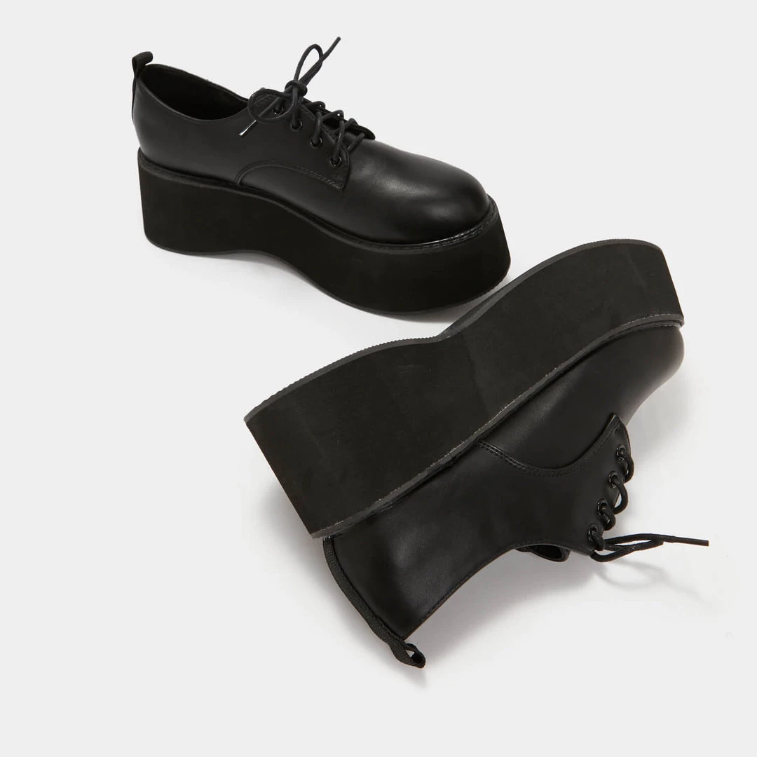 We have already given our heart to these Dojin flatform shoes. These classic black shoes comes with smooth vegan leather, lace up fastening and thick platform soles