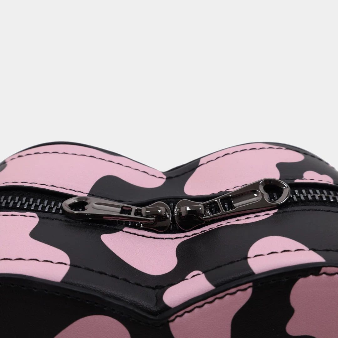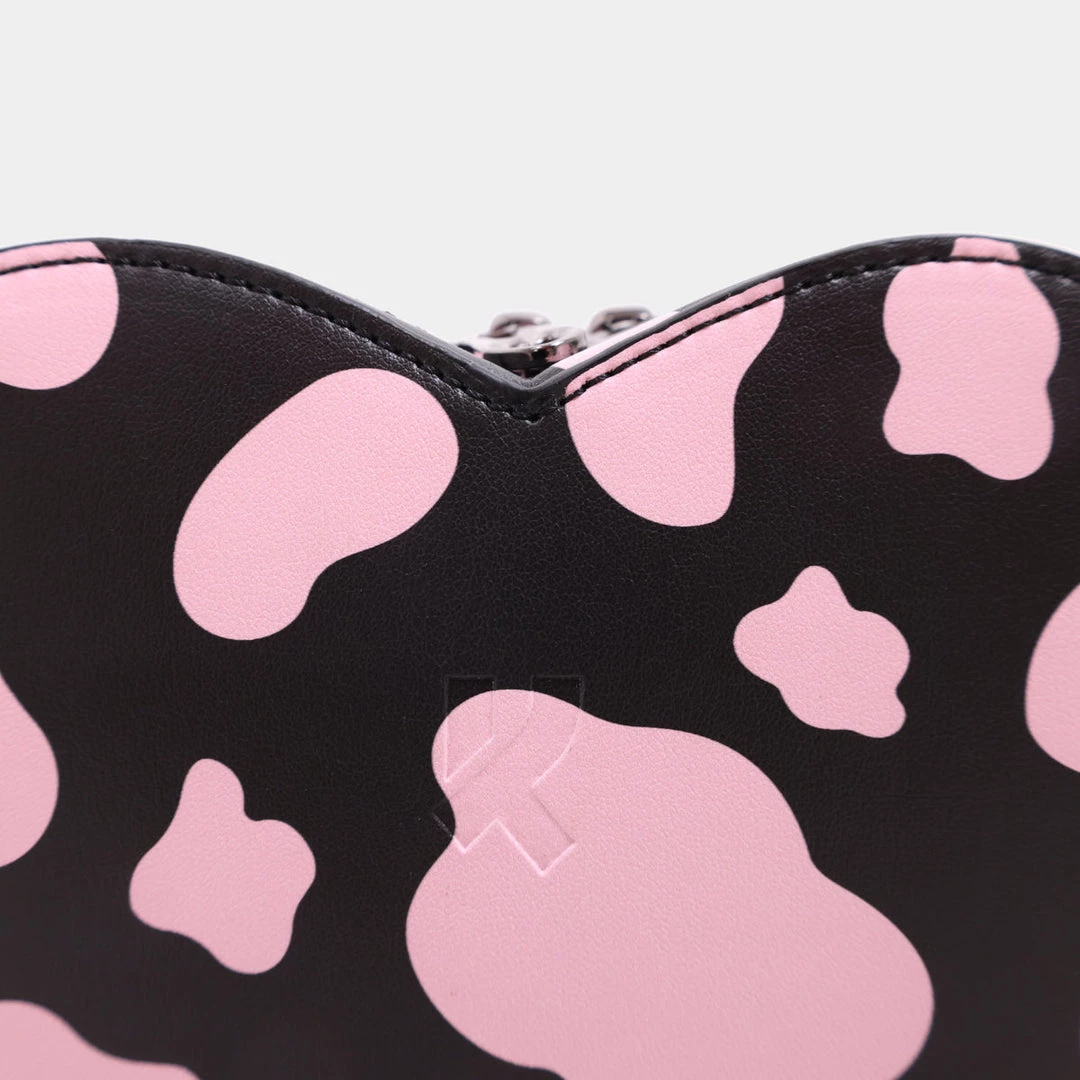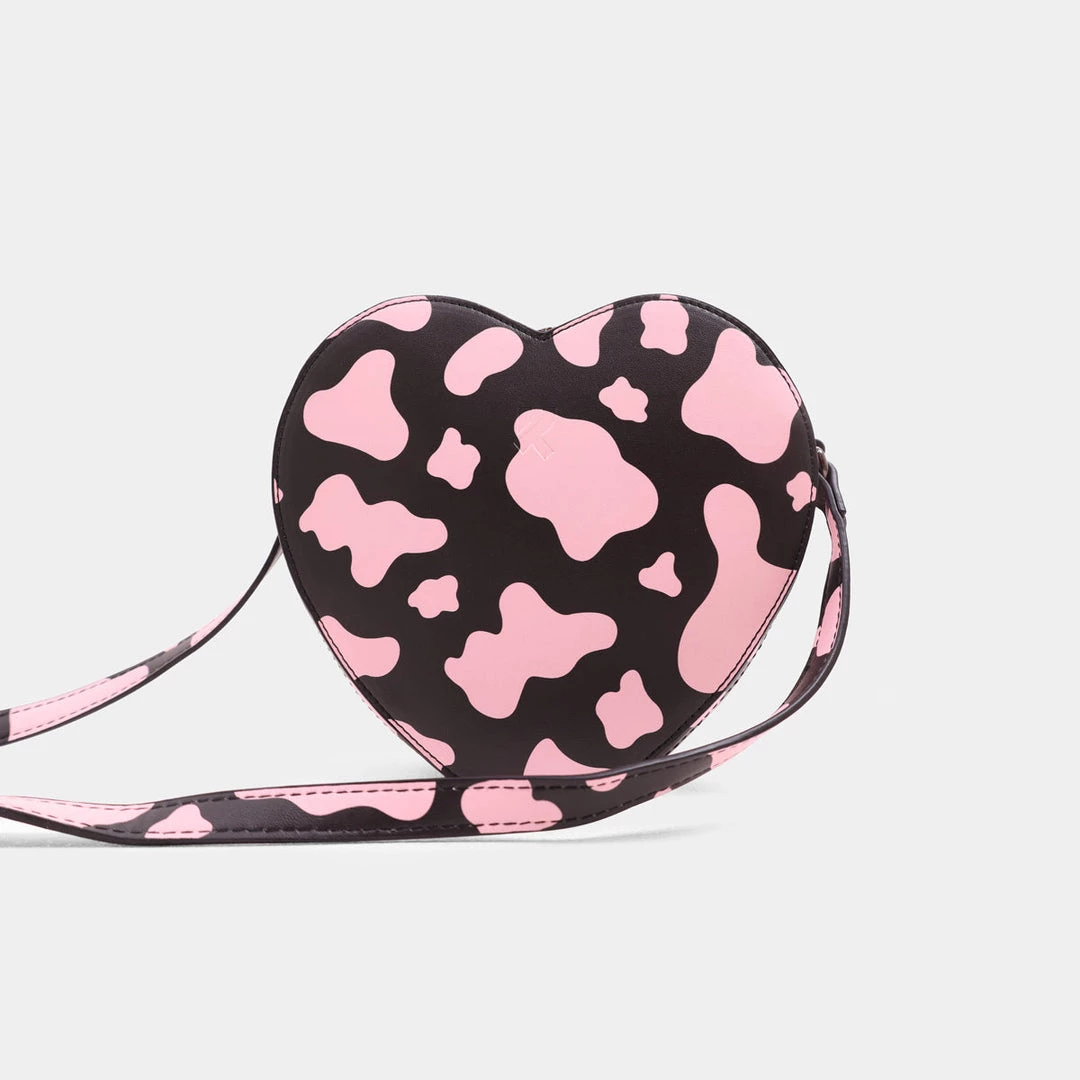 Funky goddesses, please shower some love on me! This shoulder bag has an overall cow print, made from smooth vegan leather, has the shape of a heart, a top zipper and short strap.ย