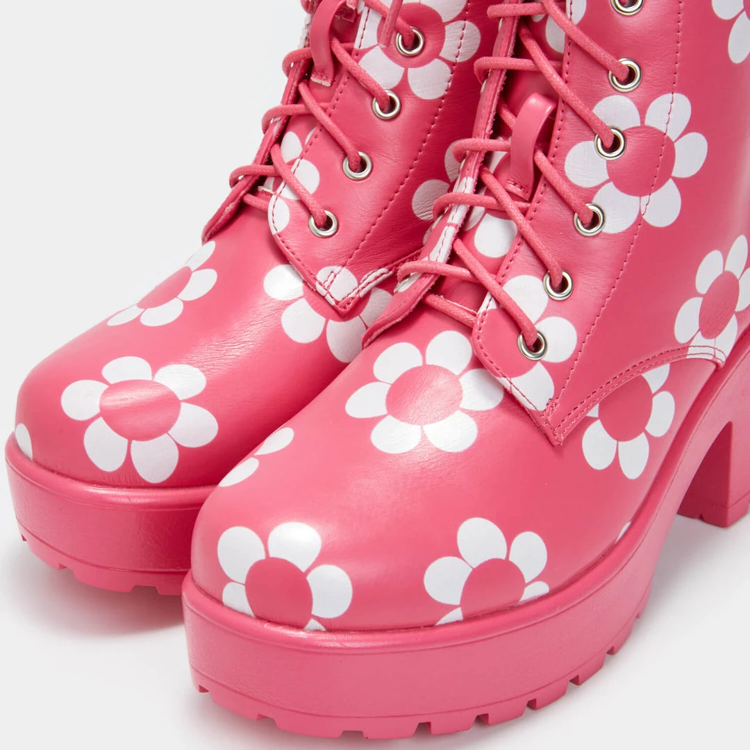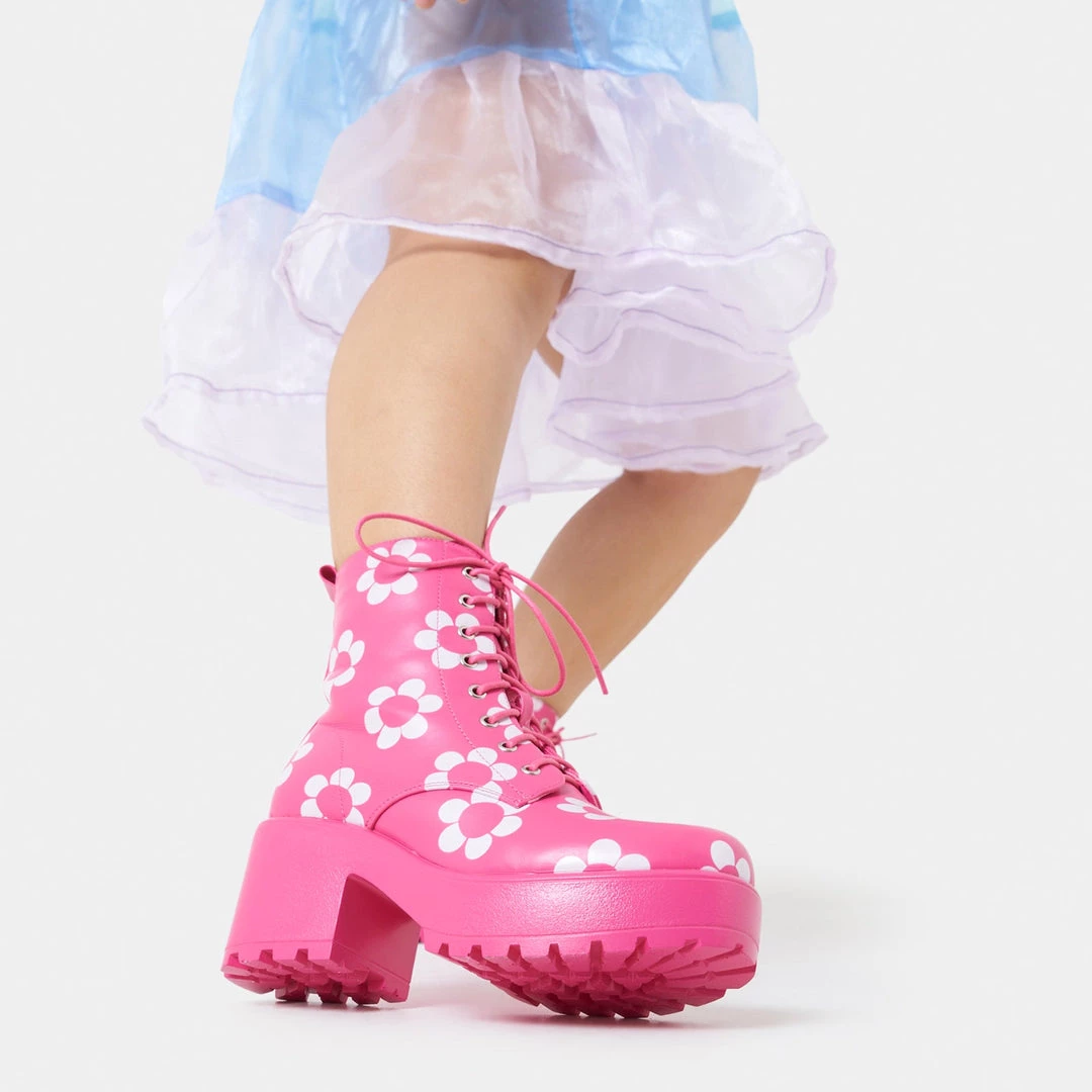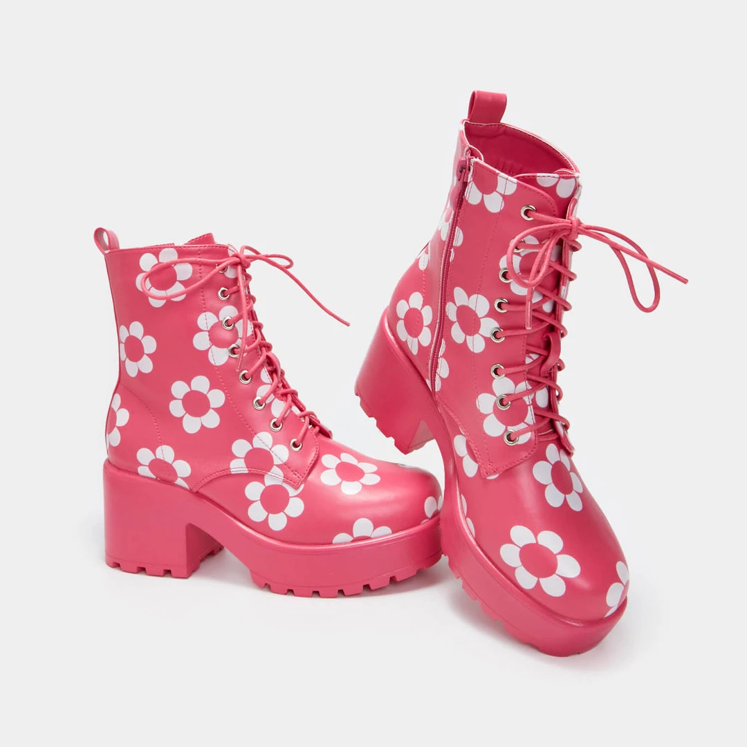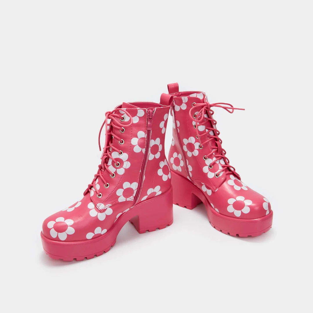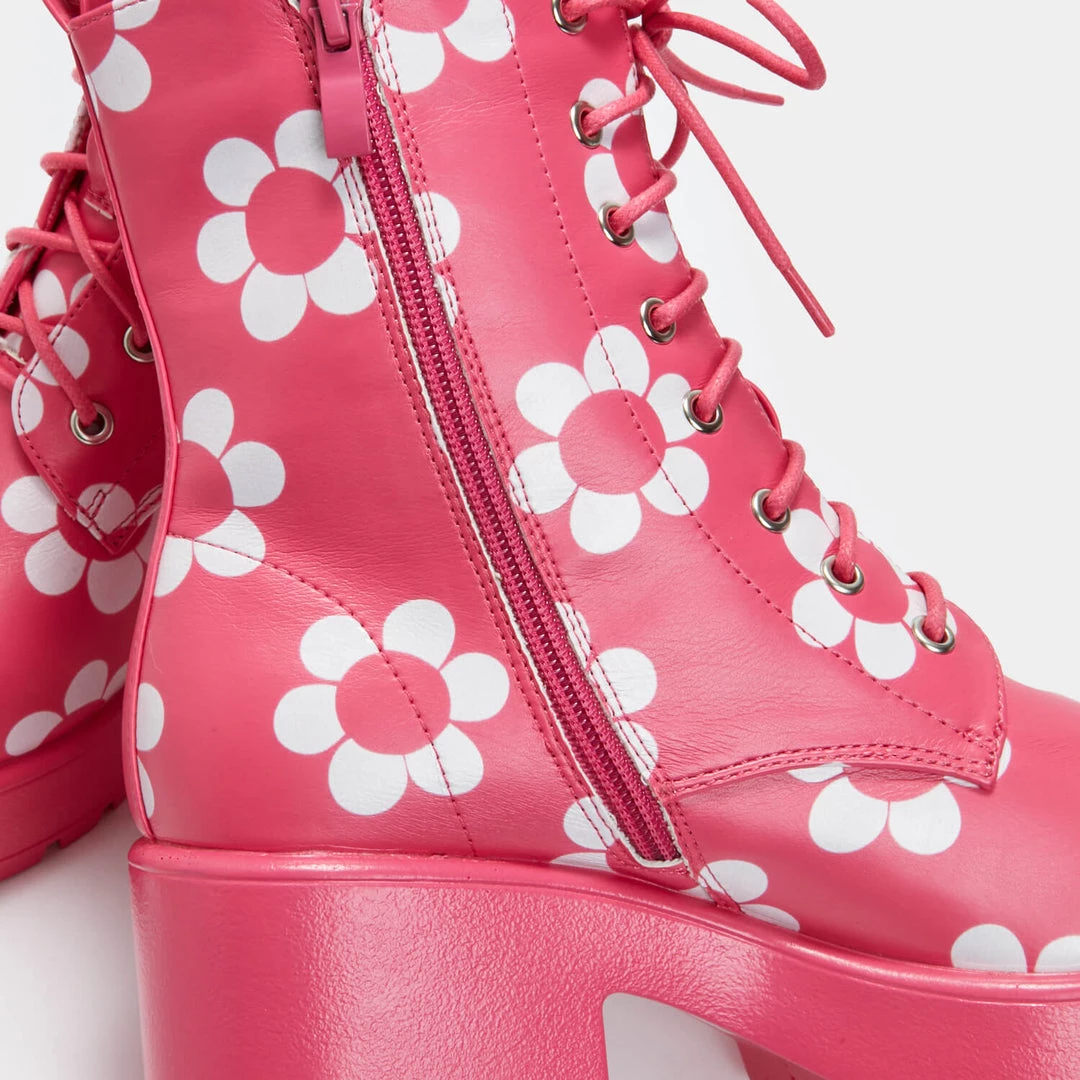 Pink makes EVERYONE wink. Koi Footwear has presented you with some chunky boots with a mini heel – ideal for summer festivals. The hot pink vegan leather is completed with the white orchis floral pattern for unlimited cuteness to make sure you’re a conversation starter all summer. These ankle boots feature chunky platform soles, front lace up, side zipper and pull tabs at the back.