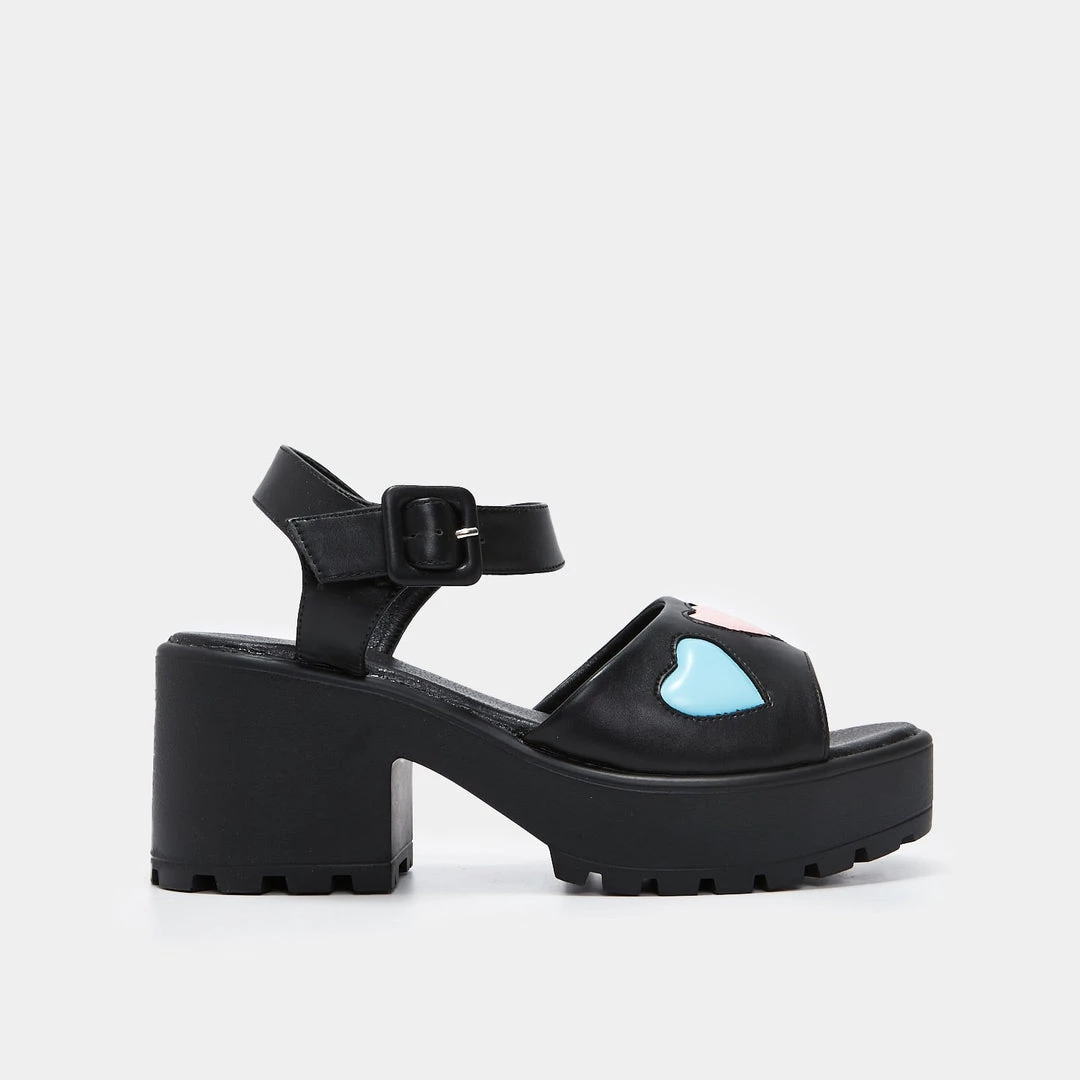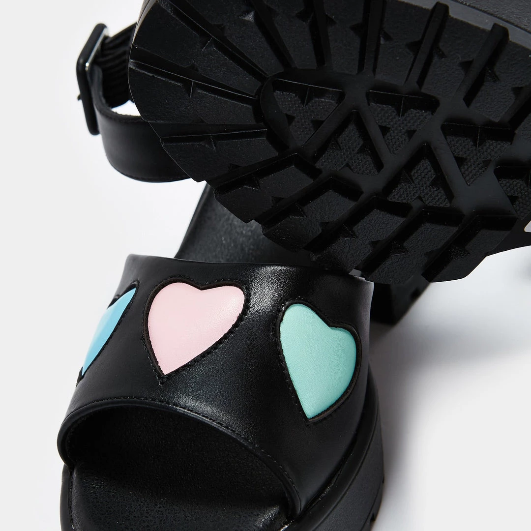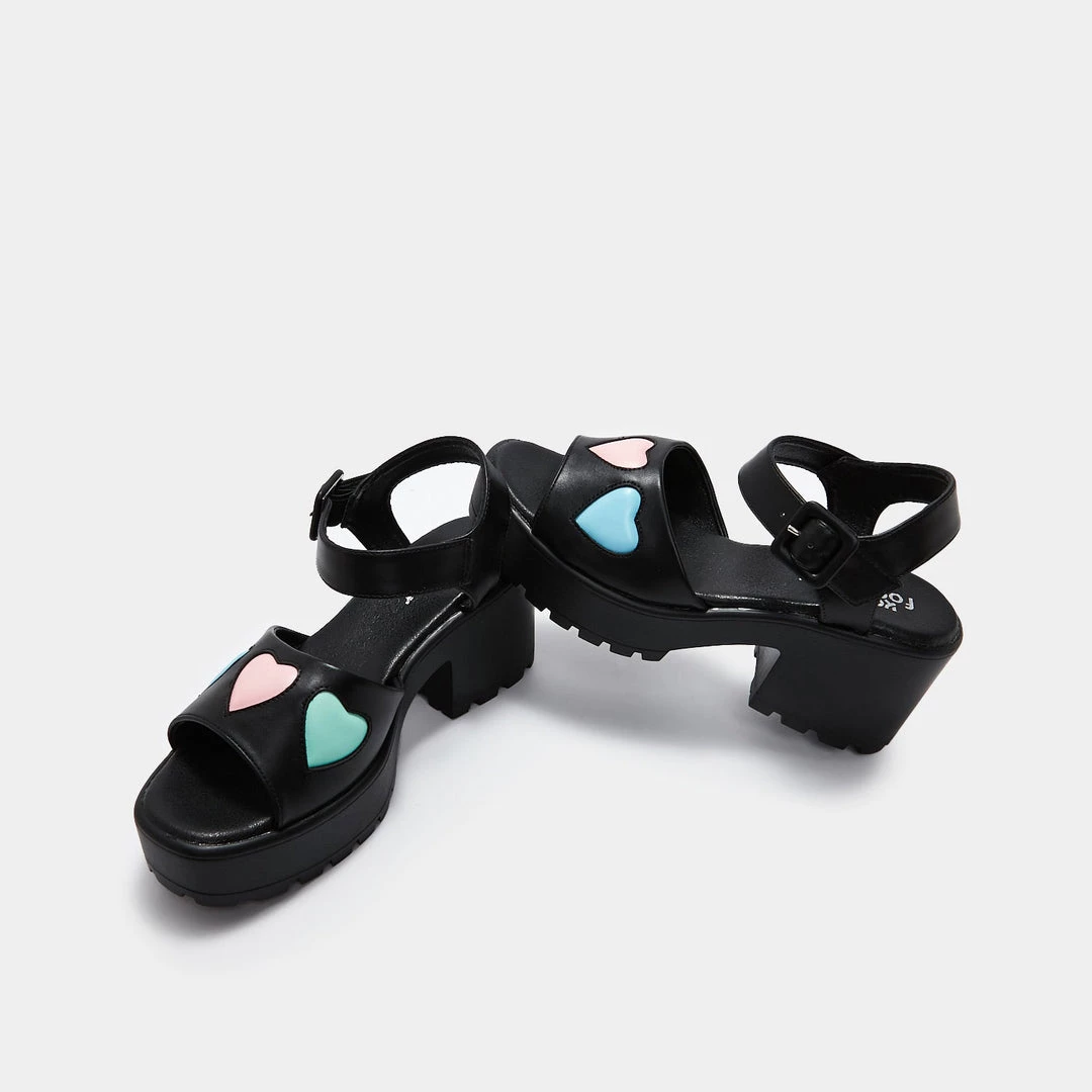 Everything is fair in love and war! My rebel heart is ready for this Heart Collection. The stylish sandals features heart embellishment, peep toe front, heart design side opening, thick buckle strap and heeled platform.
