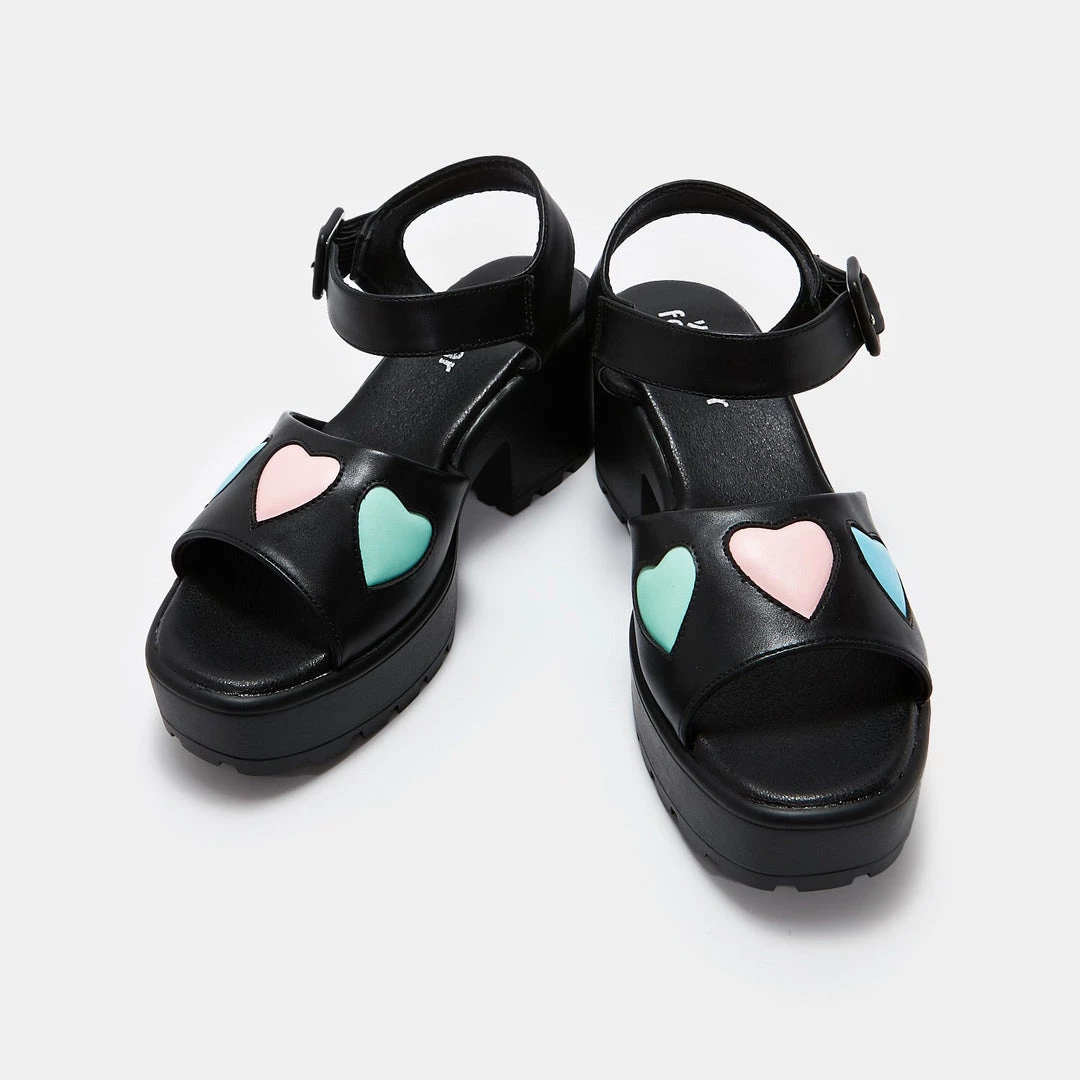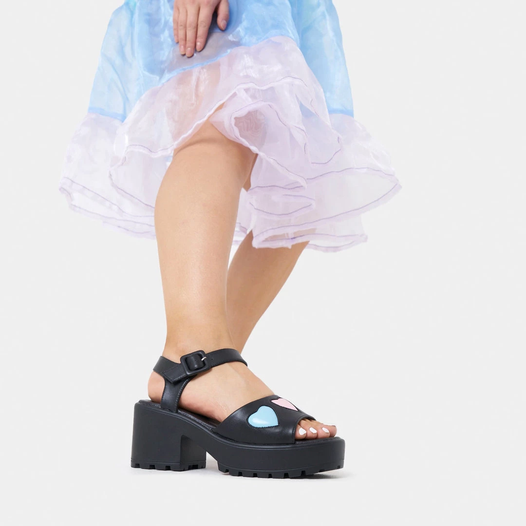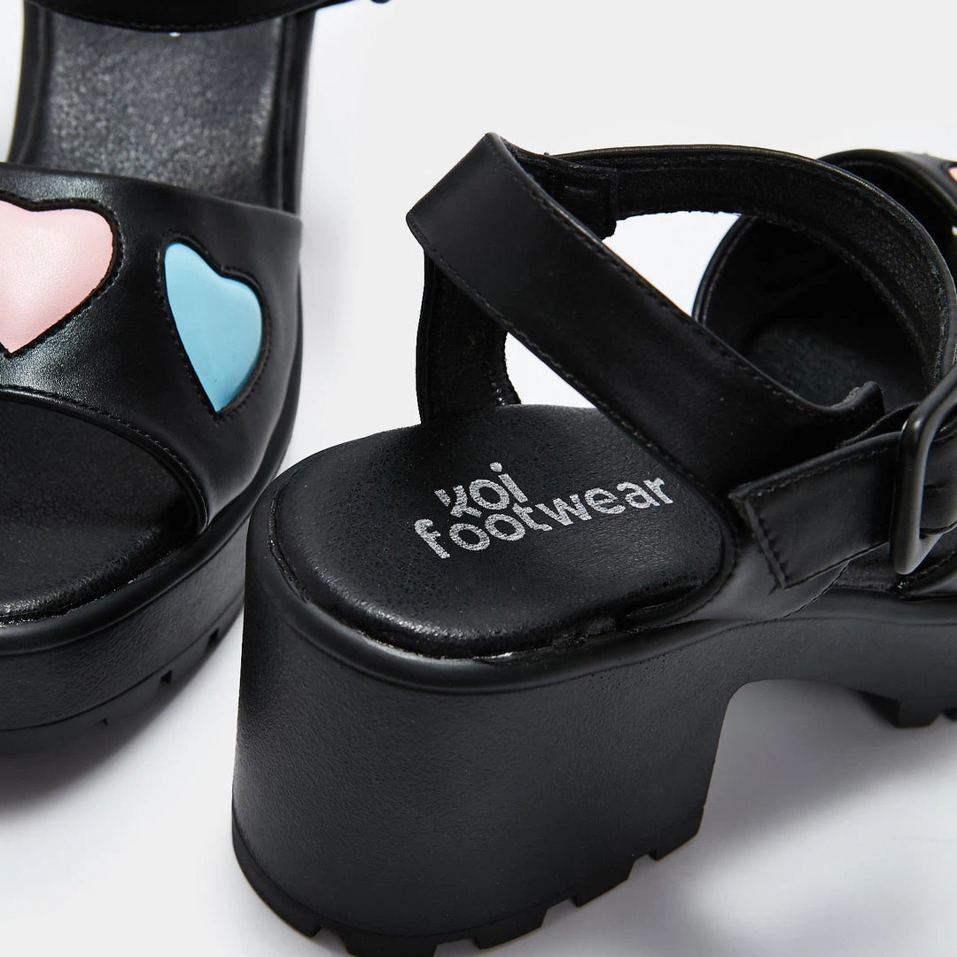 Everything is fair in love and war! My rebel heart is ready for this Heart Collection. The stylish sandals features heart embellishment, peep toe front, heart design side opening, thick buckle strap and heeled platform.