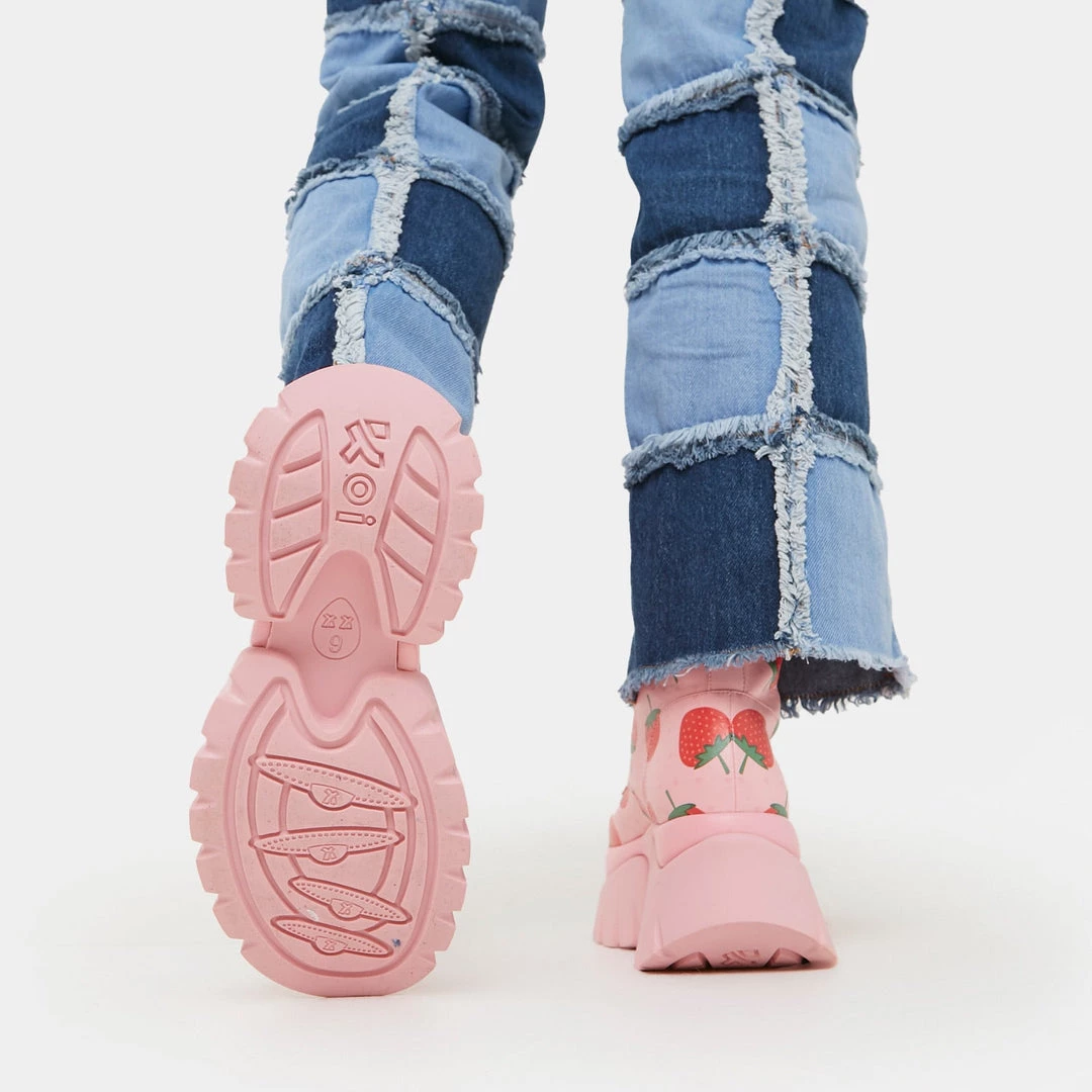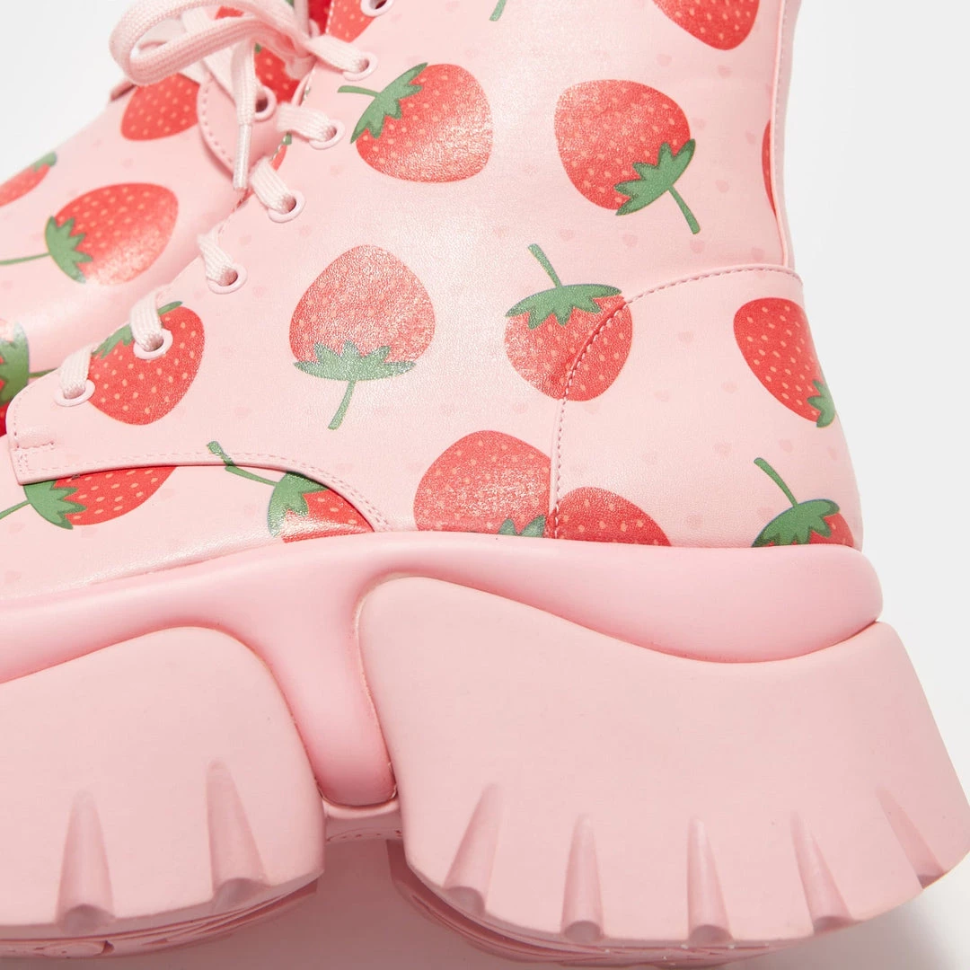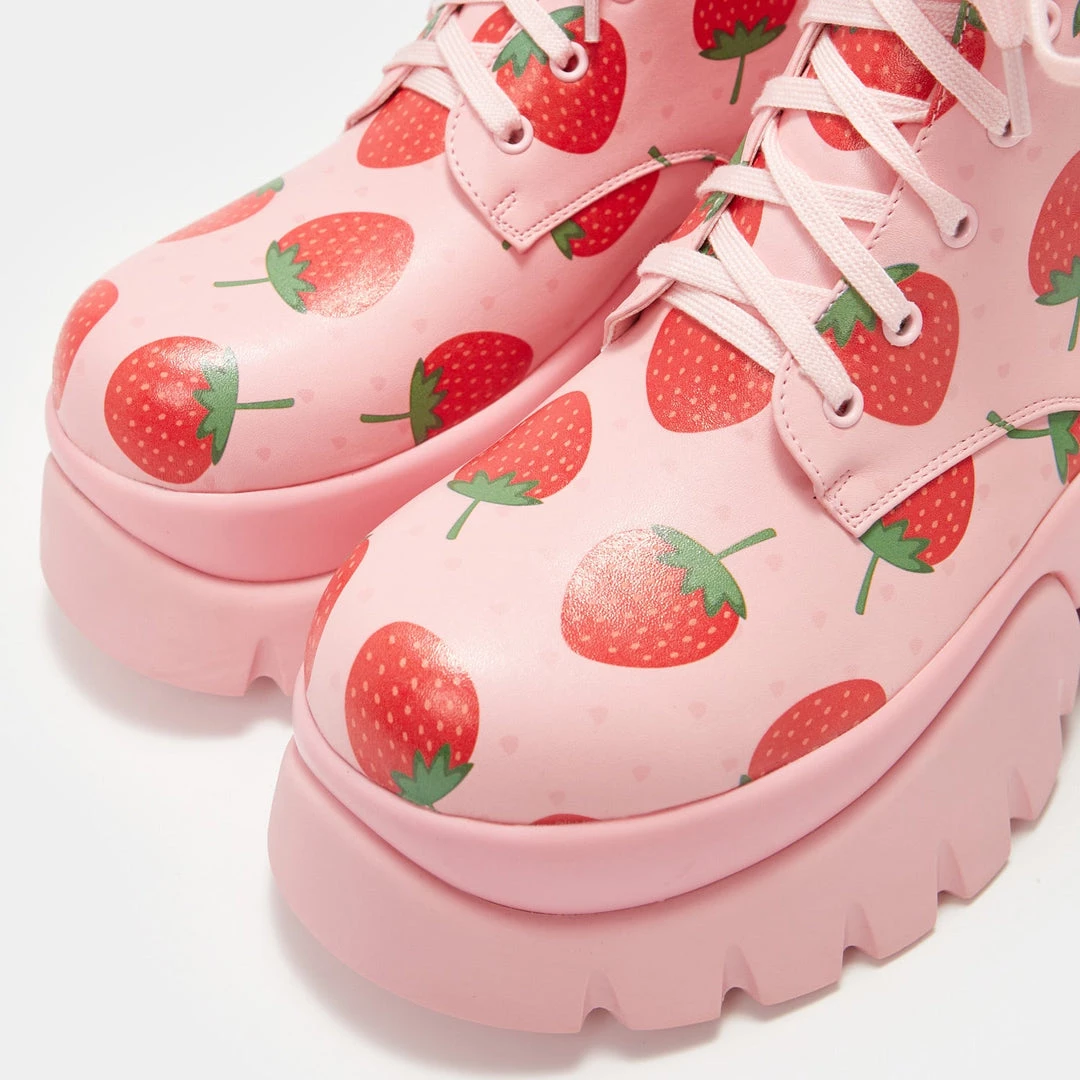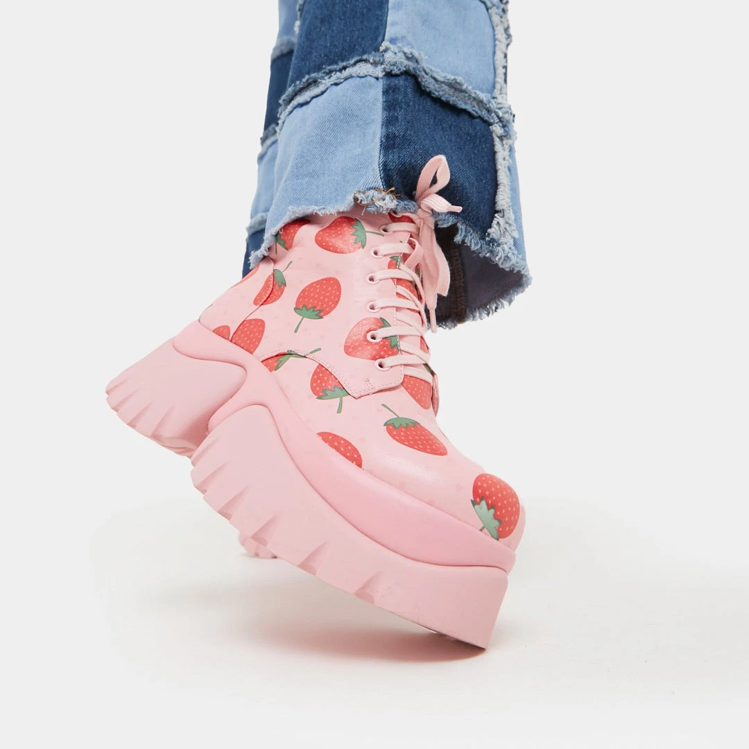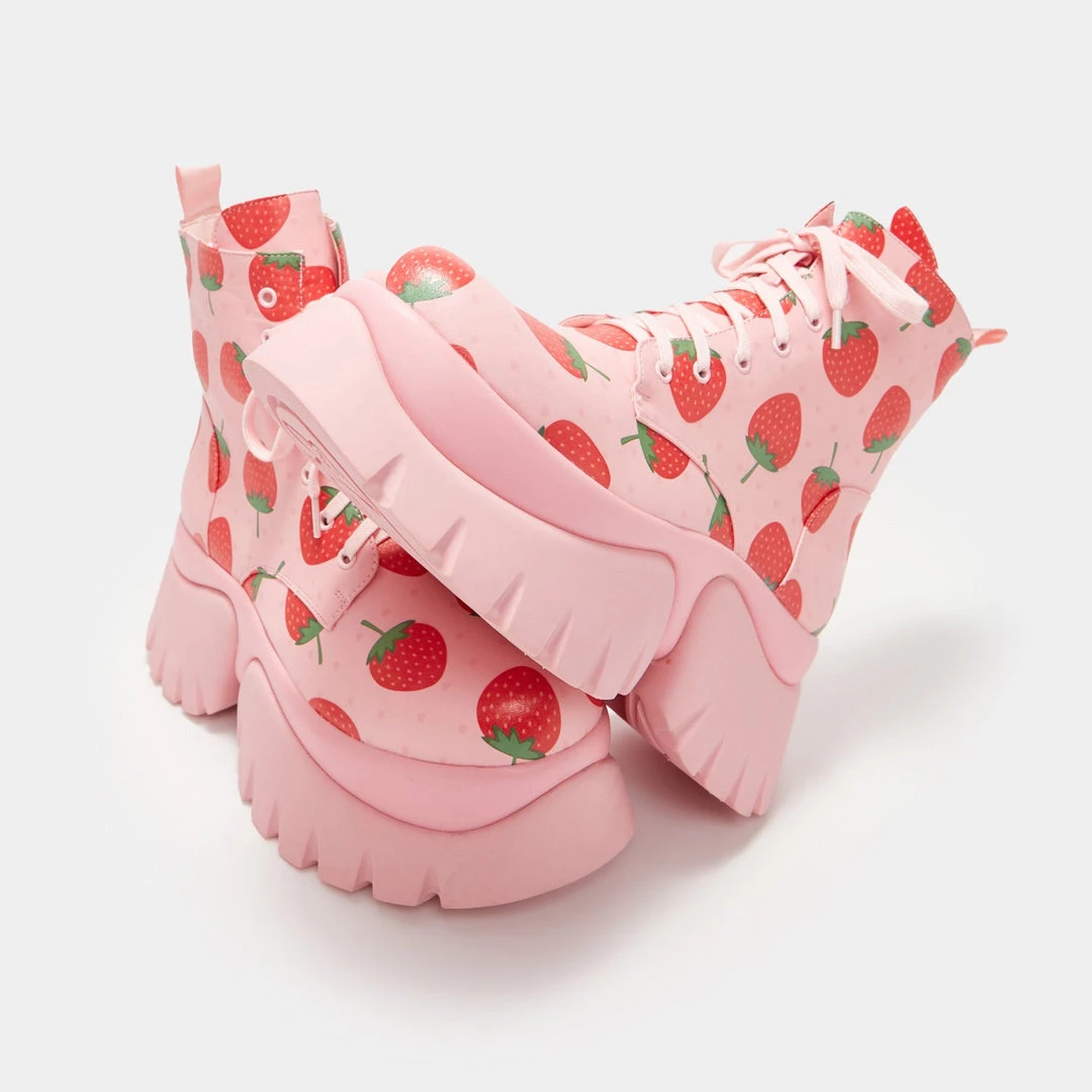 Koi Footwear’s very best pink vegan leather chunky combat boots are back in stock after a long wait! The Strawberry Shortcake Pink Vilun ankle boots lace up and are good enough to eat…Strawberry is the beloved food of goddesses like Venus, Aphrodite and You! So don’t miss out on these women’s platform boots before they sell out again, in the perfect shade of sweet pink to wear all through summer. Let’s get fruity in some cute boots for women!