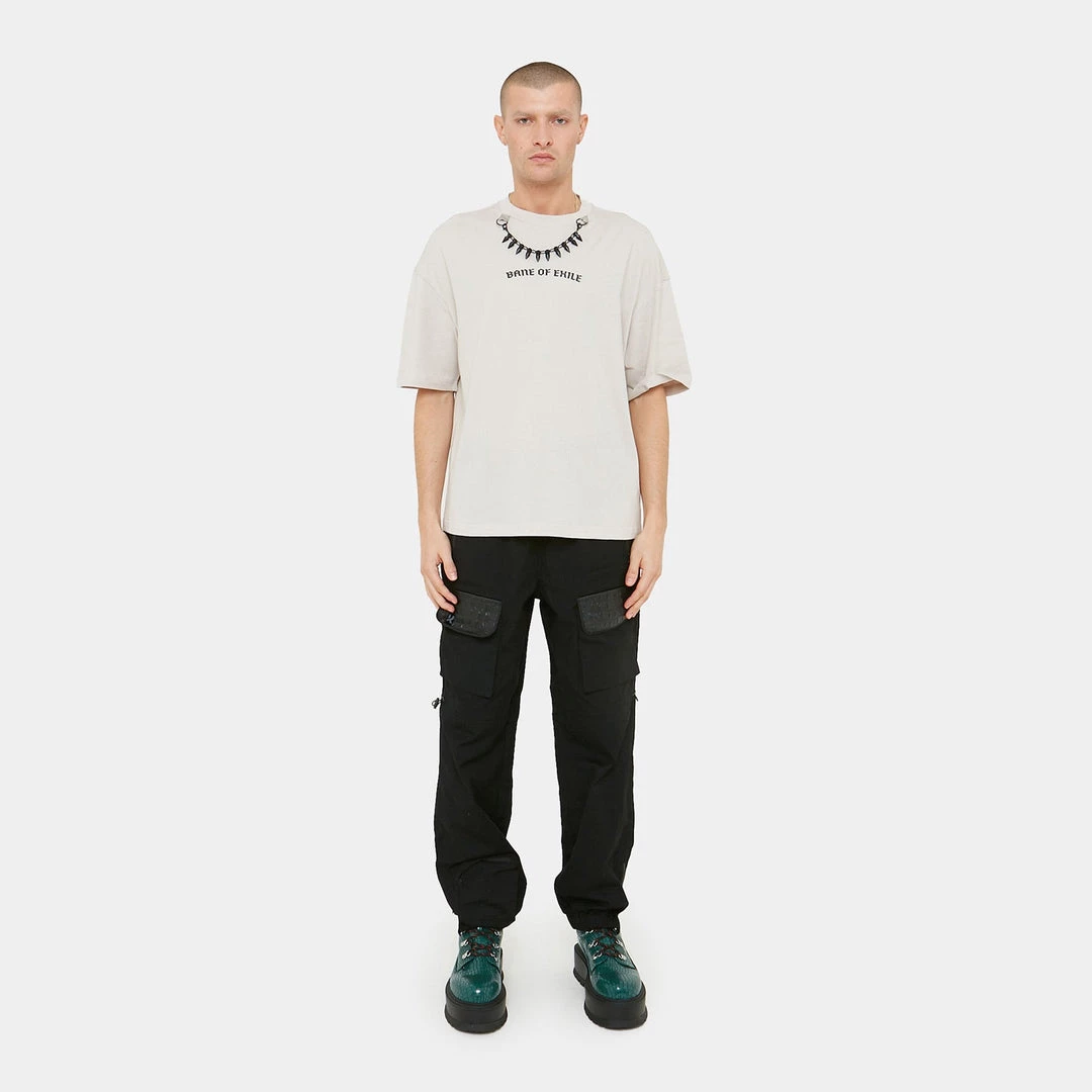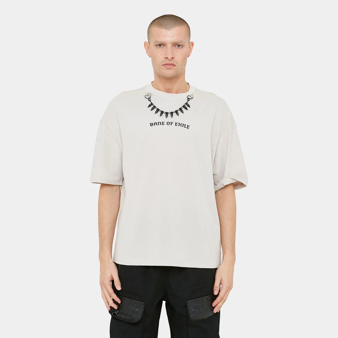 Banished from the place you once called home is that as painful as death? This boyfriend tee has an oversized fit, a rounded neckline and spiked attached necklace detail.