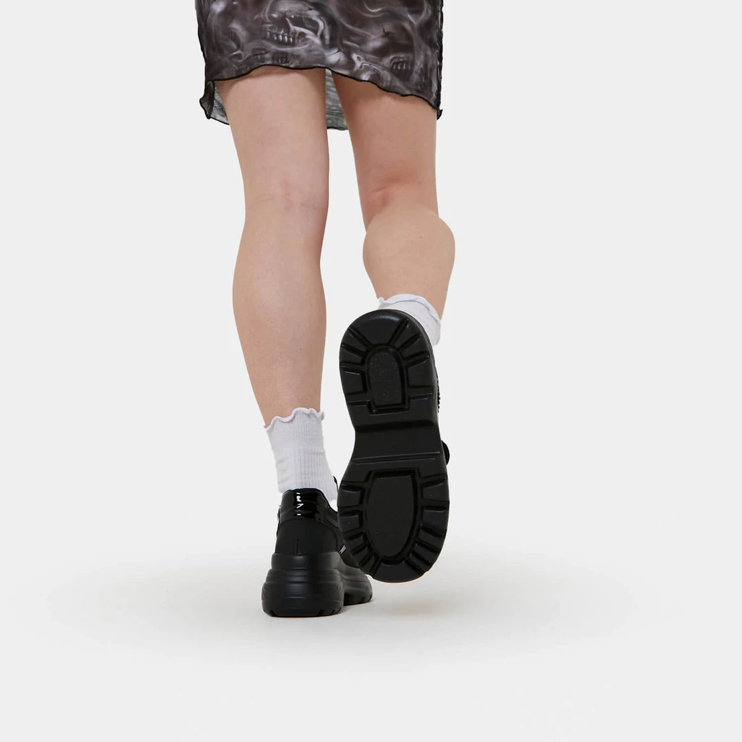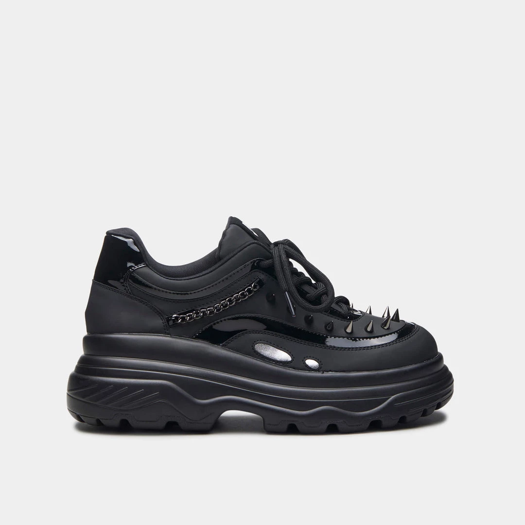 The Bane of Exile is the pain of being shunned away. Dare to be something new – these chunky black platform trainers will do just that. Go against the grain in a new pair of vegan sneakers, with an abundance of details including chains, spike studs and patent details – these trainers for men work in ways you never thought they could. Koi Footwear has provided you with a unique yet versatile pair of chunky shoes to go with any outfit whilst showing your dark side.