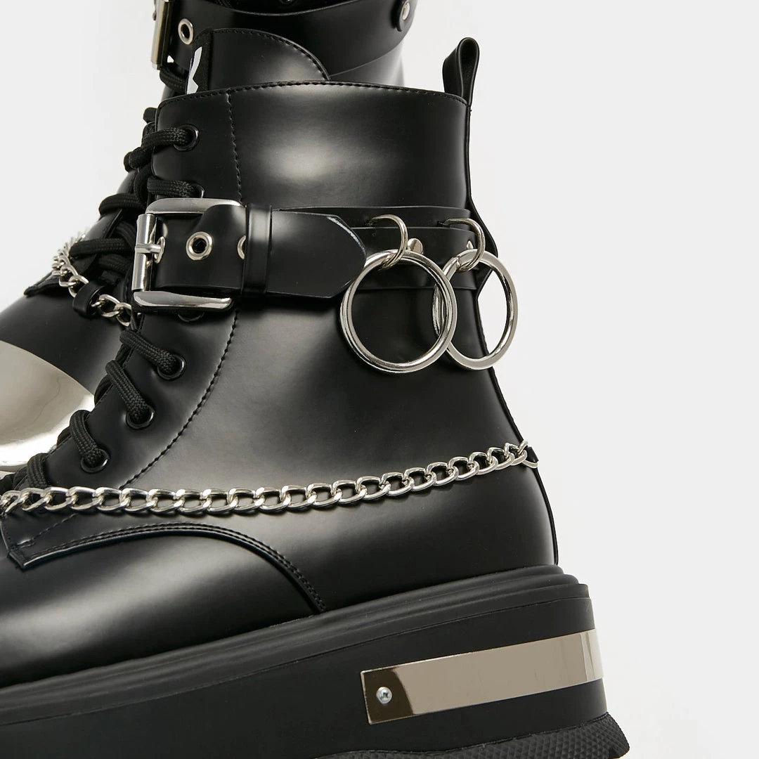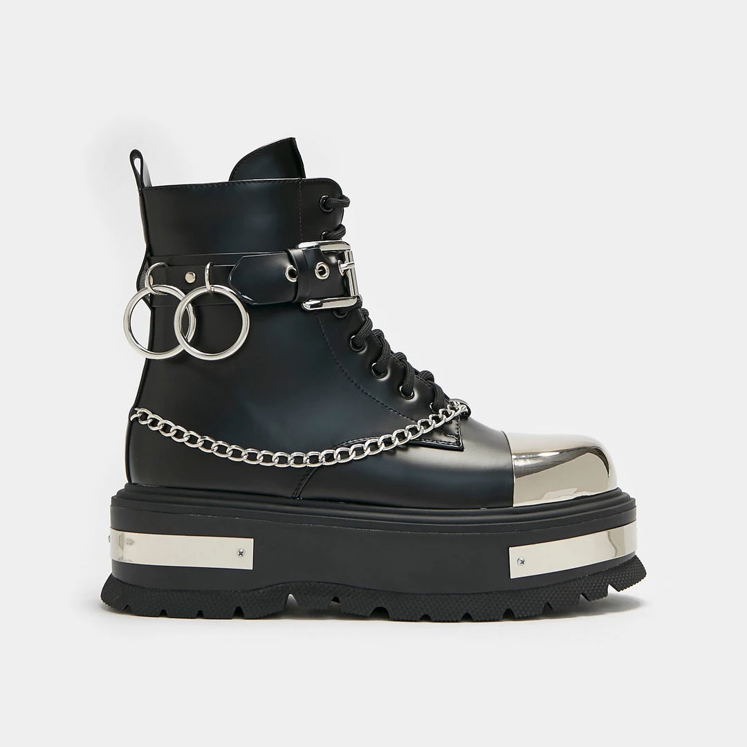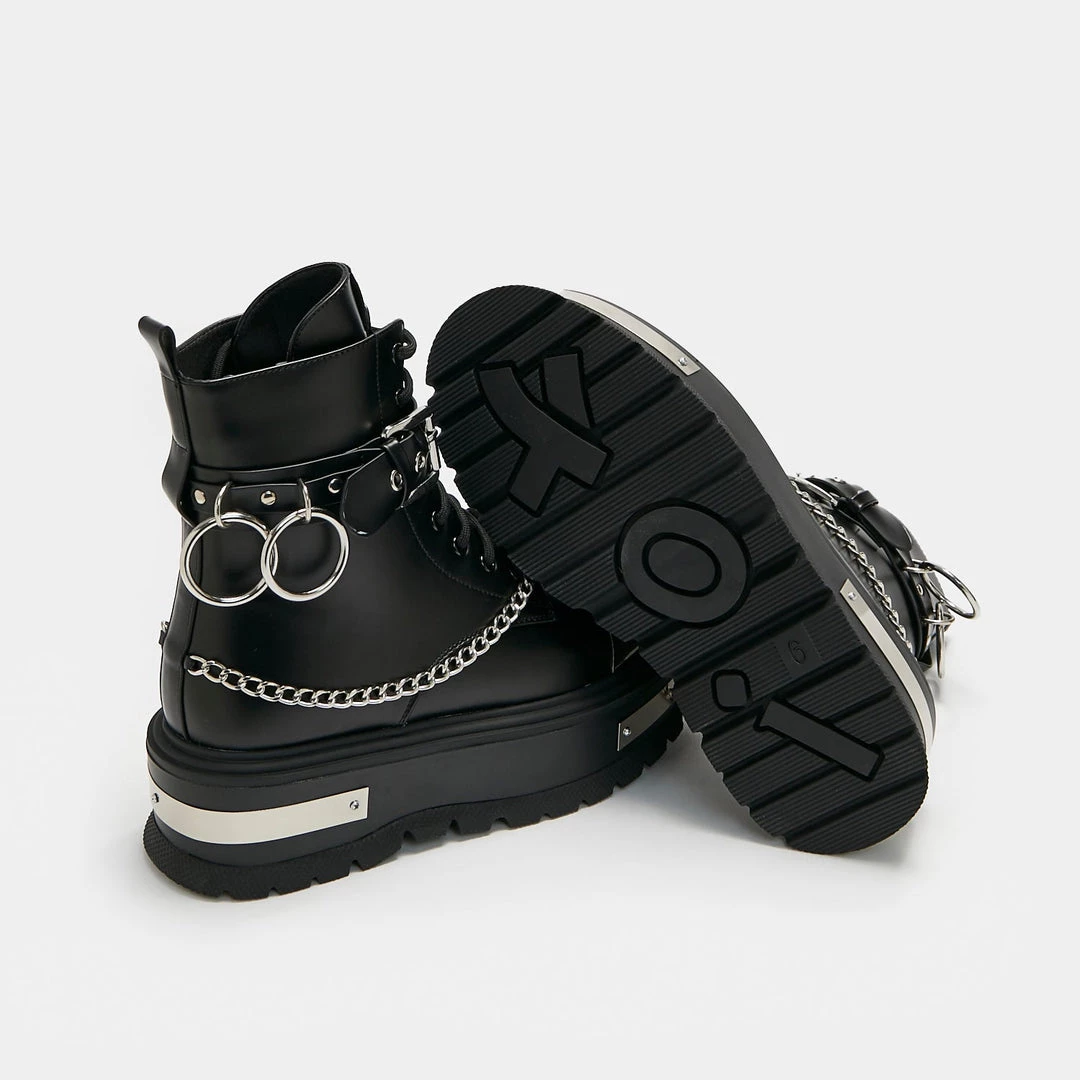 Borin are Koi Footwear’s chunky platform boots that really embody the “go hard or go home” attitude. The ultimate goth shoe…the elements all create the perfect concoction just makes sense. Vegan black leather with an abundance of of silver metallic details: including buckles, straps, chains and hardware on the toes and sole. These biker boots are not for the faint hearted.